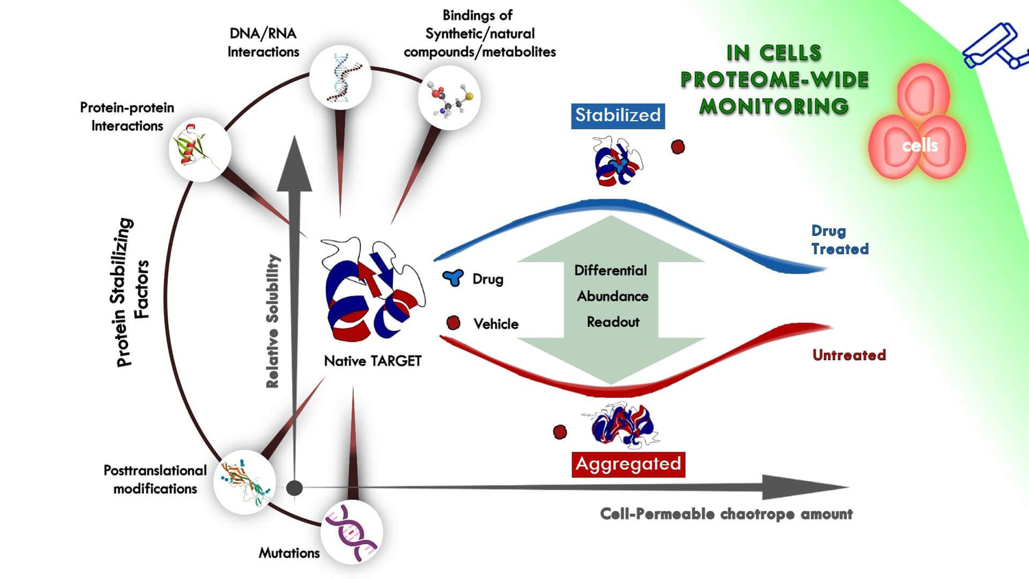For instance, proteins in the living cells are first to be treated with compound of interest and vehicle separately. The proteins in living cells are subsequently perturbed and undergo abrupt aggregation. Upon these steps, drug bound proteins in the UCeP samples is structurally stable and tend to be more soluble than unbound state. Both aggregated and stabilized form can be easily separated by simple physical separation means like centrifugation. Targets are therefore identified through measuring the abundance differences of stabilized proteins between drug treated and untreated samples.